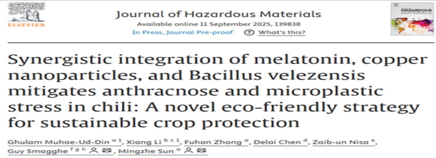 Ghulam发表论文《Synergistic integrationof melatonin,coppernanoparticles,andBacillusvelezensis mitigates anthracnose and microplastic stress in chili: A novel ecofriendly strategy for sustainable crop protection》联合采用生物分子信号(褪黑素)、微生物生物防治(贝莱斯芽孢杆菌)和纳米技术(纳米铜颗粒),可有效提高作物抗逆性。博士研究生李响为共同第一作者,孙明哲教授与贵州大学Guy Smagghe教授为共同通讯作者。该研究受大庆市领航英才庆雁支持计划——“新雁”团队项目(DQXY202402 to SMZ)、陇东学院博士科学基金(Grant No.XYBYZK2108)及庆阳市自然科学基金(Grant No.QY-STK-2024A 089)共同资助。
