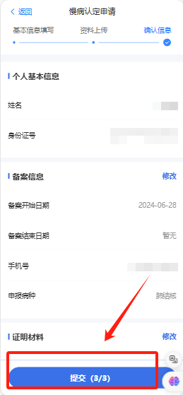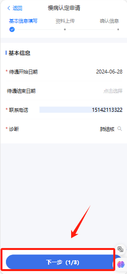 3.填写基本信息,根据提示填写认定基本信息后,点击【下一步】上传病历材料。